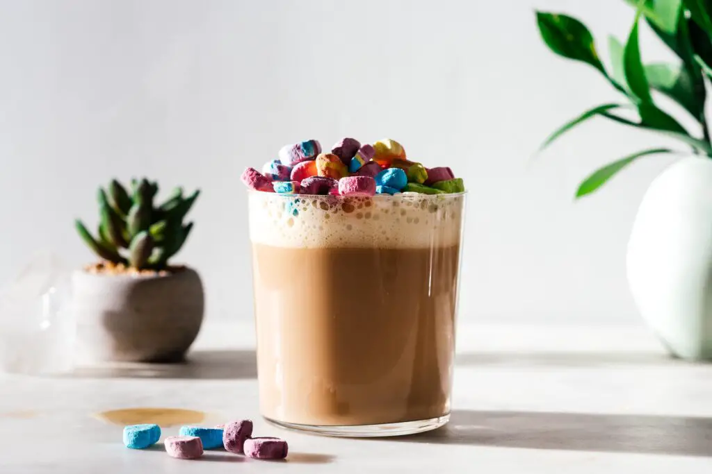 Si eres un amante de la leche con cereal y te gusta el café, prepara un café con leche con cereal cubierto con malvaviscos Lucky Charms. ¡Este año voy a hacer un pequeño giro y haré dalgona con leche de cereal!