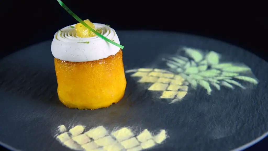 Il punto di partenza por Alíbaba, è quindi lo stesso. La pasta medesima, mi arricchita di piña escalfada, sobre cotto con agua y zucchero per poi rellena la pasta con vaniglia (una vaniglia di Tahiti molto forte, con sentori di liquirizia) y lima. La dolcezza esotica dell'ananas si ritrova anche nella pasta del babà, che viene bagnato non solo con il Rum Diplomatico (un ron ambrato venezuelano), ma anche con lo sciroppo di cottura del frutto.
